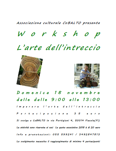 L’Arte del intreccio – Fiesole Galleria • 25 novembre 201831 Maggio 2019 • Pascale Jabain Dopo il successo delle precedente esperienze riproponiamo un workshop sull’arte dell’intreccio , sia per chi vuole progredire che per chi vuole iniziare Condividi: Fai clic per inviare un link a un amico via e-mail (Si apre in una nuova finestra) E-mail Fai clic qui per condividere su Pinterest (Si apre in una nuova finestra) Pinterest Mi piace Caricamento... Correlati