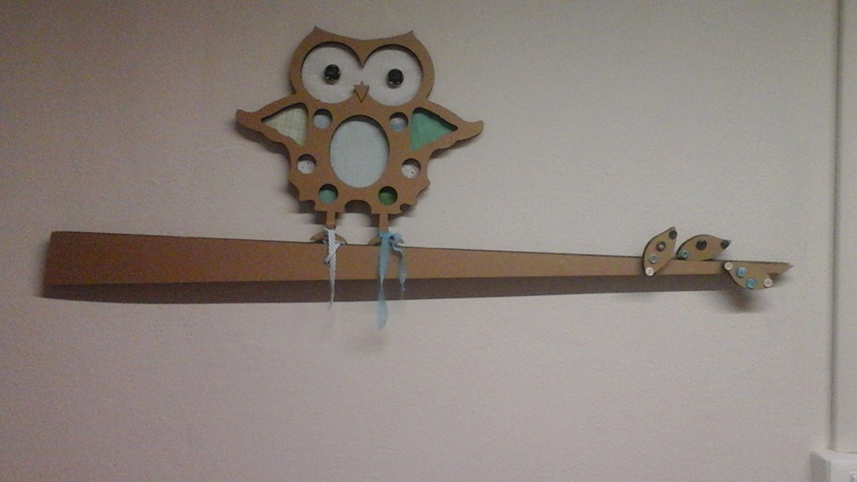 ramo con gufetto in cartone, stoffe e bottoni